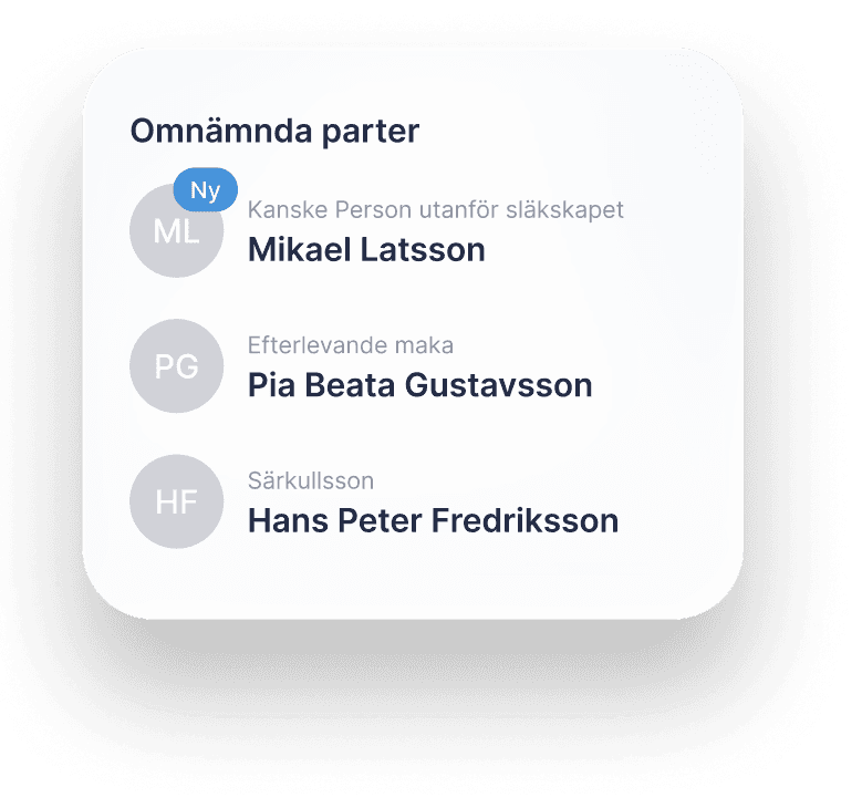 Släktträdet byggs automatiskt och beräknar förslag på arvskvoter. Systemet läser testamentet och flaggar oklarheter som kräver bedömning.